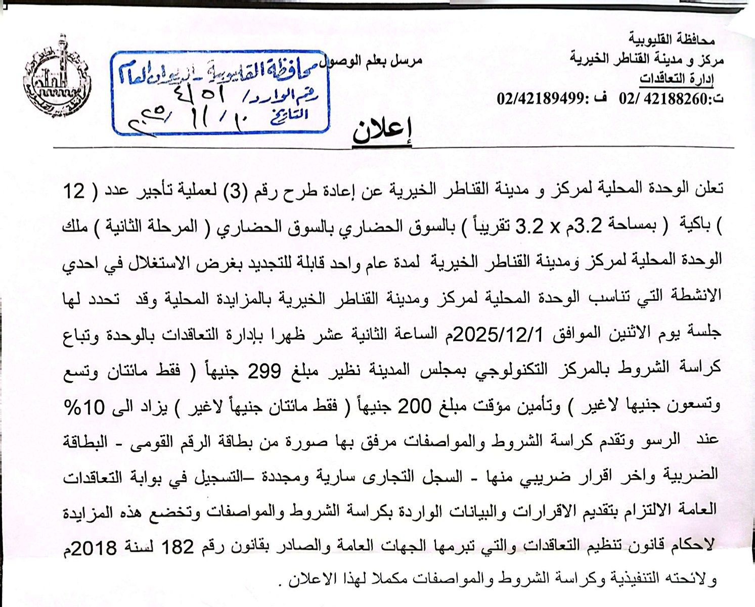 تعلن الوحدة المحلية لمركز ومدينة القناطر الخيرية عن إعادة طرح رقم (3) لعملية تأجير عدد (12 باكية) (بمساحة 3.2×3.2 م² تقريبًا) بالسوق الحضاري (المرحلة الثانية) بالسوق الحضاري ملك الوحدة المحلية لمركز ومدينة القناطر الخيرية لمدة عام واحد قابل للتجديد بغرض الاستغلال في أحد الأنشطة التي تناسب الوحدة المحلية لمركز ومدينة القناطر الخيرية بالمزايدة العلنية.