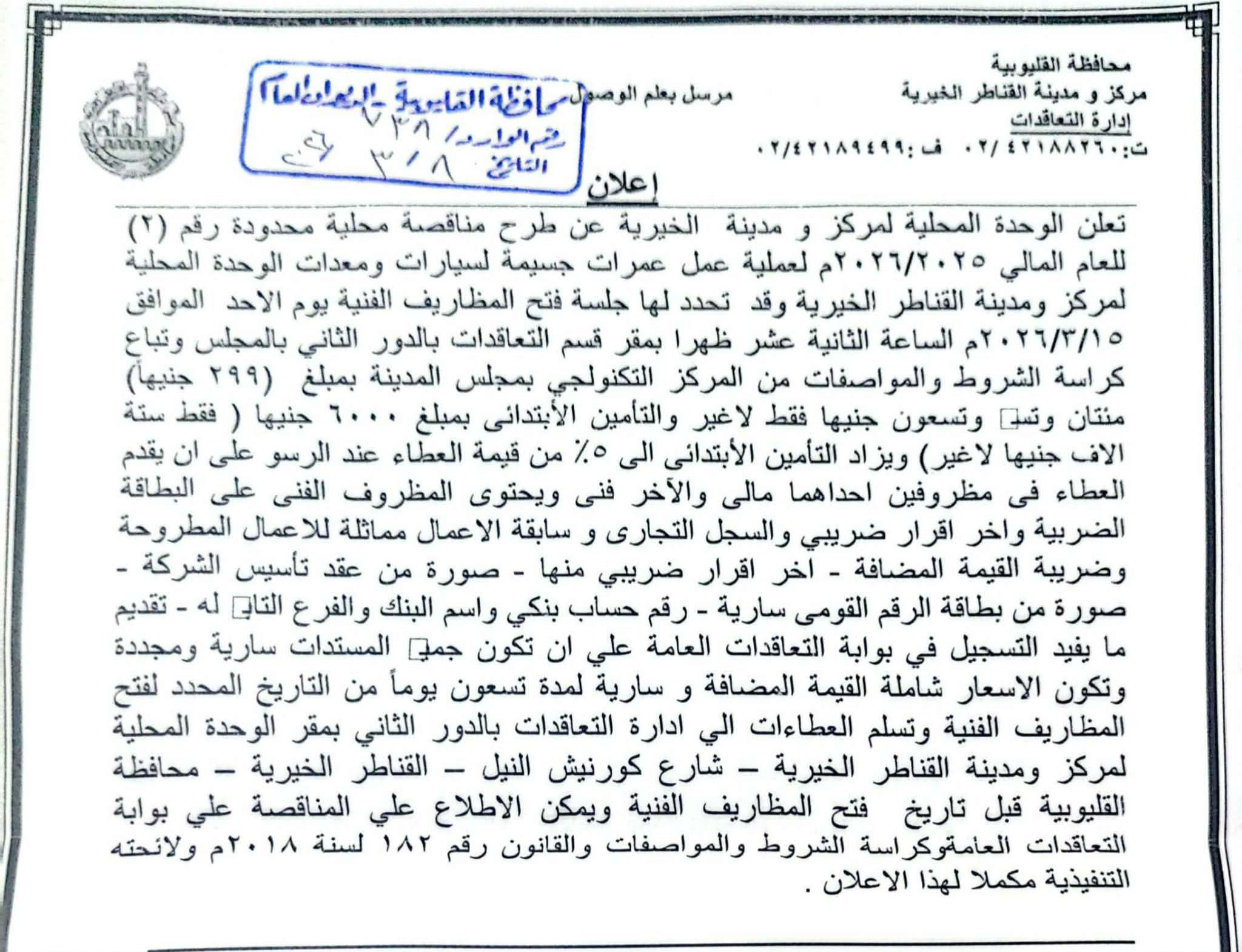 إجراء المناقصة المحدودة رقم (2) لطرح عملية دهان الواجهة الأمامية لمجلس المدينة، وقد تحدد لها جلسة يوم الأربعاء الموافق 2025/12/17 الساعة الثانية عشر ظهراً بمقر قسم التعاقدات بالدور الثاني بالوحدة المحلية لمركز ومدينة القناطر الخيرية