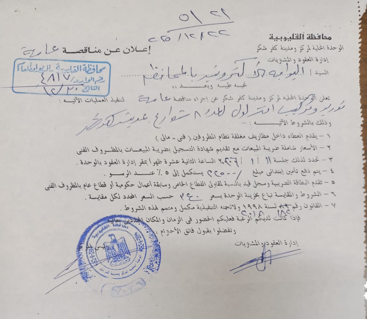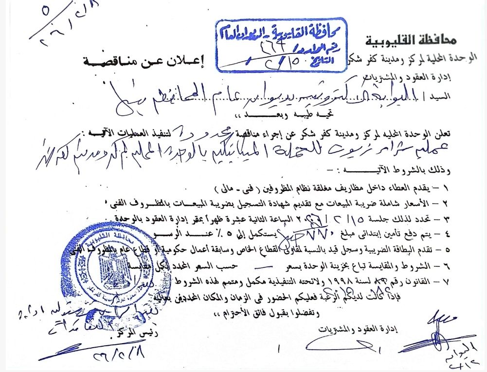 إجراء مناقصة عامة لتنفيذ عملية توريد وتركيب انترلوك لعدد 8 شوارع بمدينة كفر شكر وقد تحدد لذلك جلسة 2026/1/11 الساعة الثانية عشر ظهرا