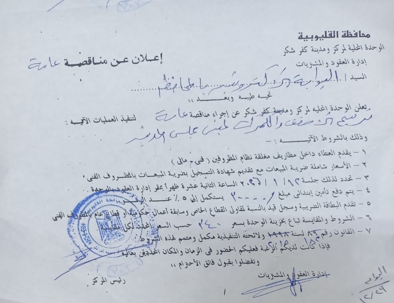إجراء مناقصة عامة لتنفيذ عملية ترميم الأسقف والكمرات لمبنى مجلس مدينة كفر شكر وقد تحدد لذلك جلسة 2026/1/12 الساعة الثانية عشرة ظهرا